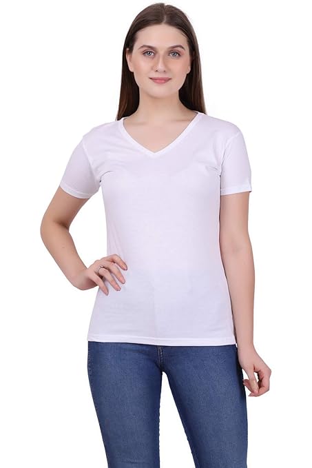 Women Plain V Neck White T-Shirt.